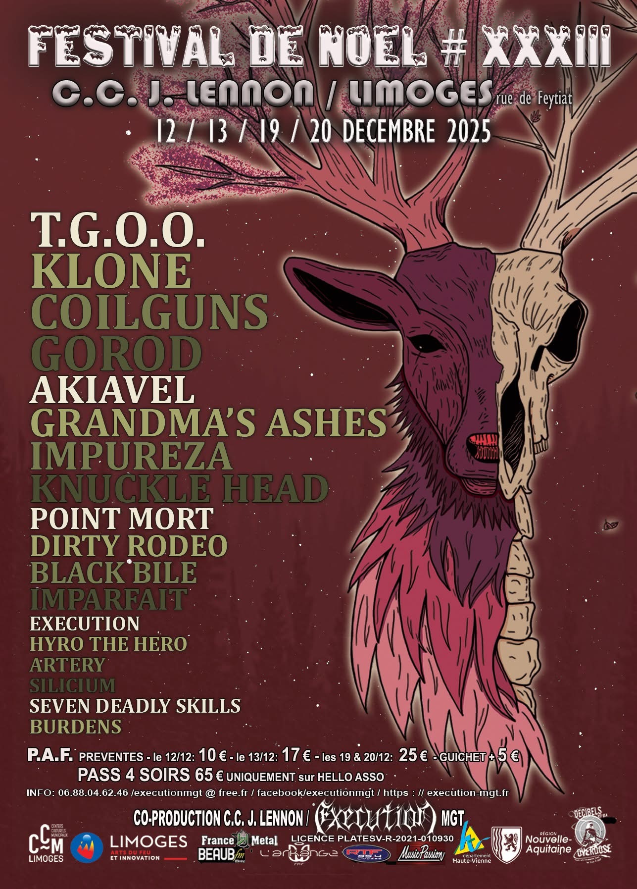 Le Festival de Noël XXXIII qui se tient à Limoges, les 12/13/19/20 Décembre 2025. Avec des groupes tels que Gorod, Akiavel, Black Bile, Coilguns…