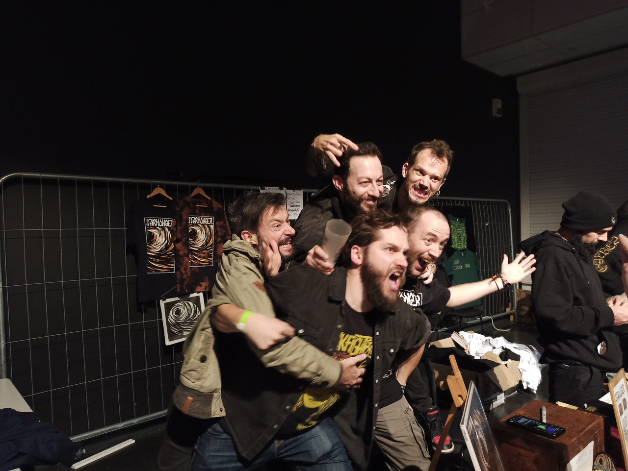 L’un des sets que j’attendais le plus sur cette édition du Westill. J’adore les compos du trio parisien, leur univers parfois bien barré, l’état d’esprit des musiciens qui ont l’air tout aussi barrés que certains de leurs titres. Je n’ai pas été déçu par leur passage sur scène, hormis peut-être un poil du coté de la lourdeur de leurs titres en live. Je m’attendais à un son plus massif, à une basse plus lourde qui nous enveloppe davantage, mais également à un travail sur les lumières plus intimiste, avec davantage de pénombre, de volutes de fumée. Leur set gagnerait sans doute +3 en envoutement et +5 en compétences occultes. Ceci dit, je garde tout de même un excellent souvenir de ce concert, de leur bonne humeur (malgré un tout petit incident technique sur la batterie), de la setlist au top qui a fait la part belle à leur excellent dernier album en date (Occultation), mais aussi du reste de la journée où les musiciens et leur crew ont pu assister au reste des concerts depuis leur stand de merch qu’ils n’ont pas quitté de la journée. Nous avons pu les croiser à plusieurs reprises, notamment le bassiste avec qui nous avons pu échanger une dizaine de minutes et qui était très content que le set nous ait plu ainsi que de leur présence au Westill (eux qui sont habituellement du coté du public). Nous l’avons senti très sincère et très heureux d’avoir su captiver le public. Juste avant le passage d’Orange Goblin, le batteur du groupe à demandé à Harry Armstrong, bassiste d’Orange Goblin, s’il pouvait porter un T-Shirt Starmonger pendant leur set. Et c’est ce qu’il a fait, nous offrant à cette occasion une effusion de joie de la part des membres de Starmonger (voir photo ci-dessous). Je regrette de ne pas leur avoir pris davantage qu’un badge sur leur stand de merch.
