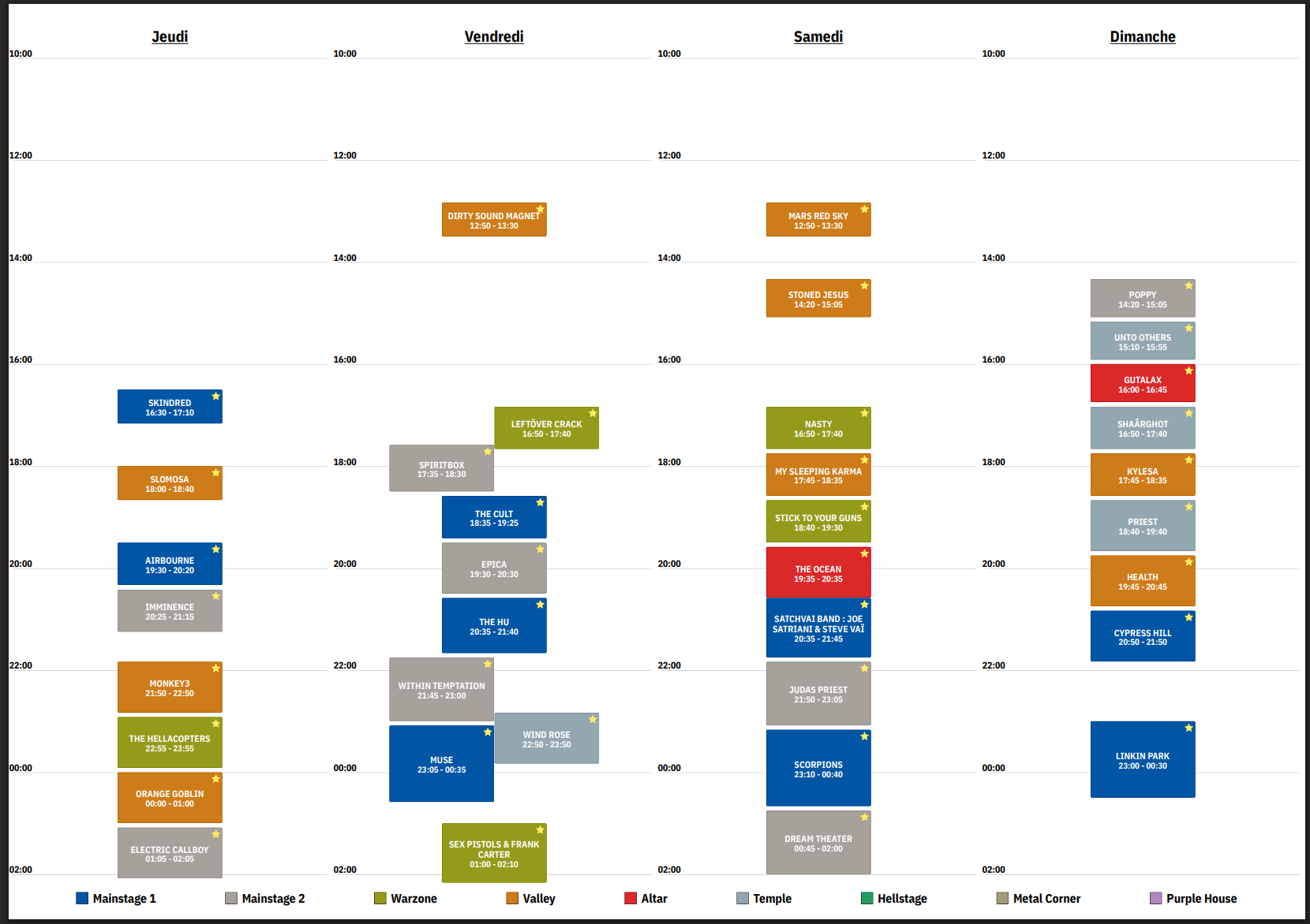 Pas plus d’une fois tous les 3 ans je suis complètement d’accord et je pourrais même dire tous les 4 ans. En fait ce qui me dérange c’est le fait que le groupe n’ait jamais joué soit un critère de programmation (et ça l’est sinon il faut arrêter avec cette stat). Pour moi on ne devrait pas s’occuper de qui est déjà venu (en évitant bien sûr les groupes venus lors des 2 ou 3 dernières éditions) et essayer de faire la meilleure prog possible en fonction des groupes qui tournent et de ce qu’ils ont à proposer (nouvel album, tournée spéciale anniversaire ou adieu etc…). Après qu’il y ait 30 ou 70% de groupes jamais venus importe peu.