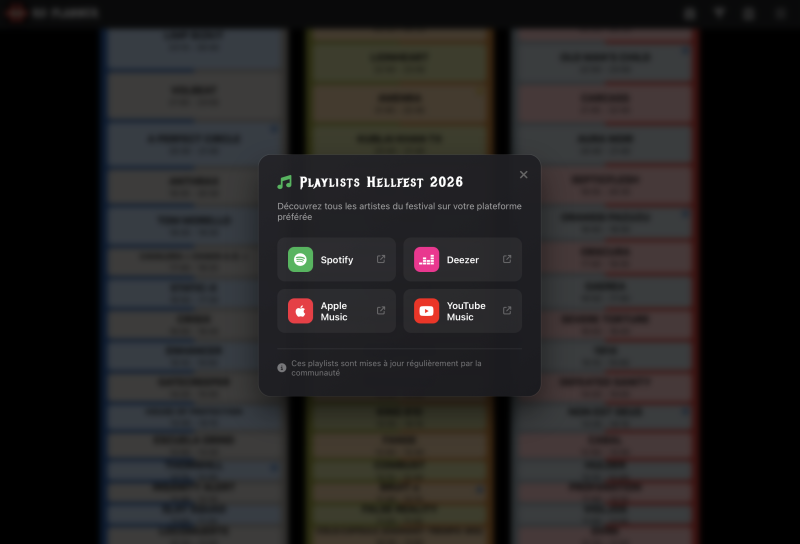Retrouvez ici les playlists des groupes à l’affiche, créées par la communauté, pour Spotify, Deezer, Apple Music et YouTube Music.